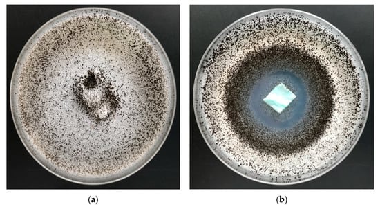 The PLA–ALG–Cu2+ composites antimicrobial activity tests against Aspergillus niger (ATCC 6275). Inhibition properties of fungal growth on Petri dishes: (a) PLA and (b) PLA–ALG–Cu2+−2.