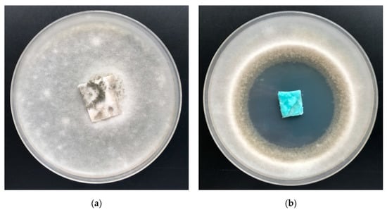 The PLA–ALG–Cu2+ composites’ antimicrobial activity tests against Chaetomium globosum. Inhibition properties of fungal growth on Petri dishes: (a) PLA and (b) PLA–ALG–Cu2+−2.