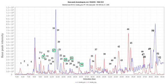 Total ion chromatogram of the crude extract of Avicennia lanata (blue and red lines represent positive and negative ionisation modes, respectively). Dereplication of numbered peaks is shown on Table 1. Boxed in green are the isolated compounds.