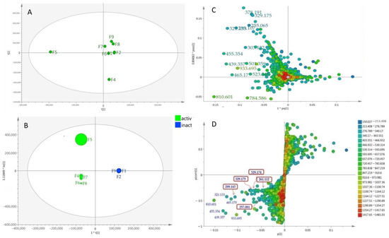 The relationship between the occurrence of the metabolites in the different A. lanata fractions and their bioactivity against T. b. brucei were evaluated through multivariate analysis. The unsupervised Principal Component Analysis (PCA) scores plot showed moderate separation of the A. lanata fractions (Figure 2A). There was a clear separation between the bioactive fraction F5 and the other fractions that were also active against T. b. brucei. Fraction F4, which also possessed moderate activity, was likewise set apart from other fractions (Figure 2A). Meanwhile, a supervised multivariate OPLS-DA scores plot analysis (Figure 2B) exhibited two classes-fractions F1, F2, F3 and F9 were the inactive group and clustered very close together, while fractions F4, F5, F6, F7 and F8 were the active group, with fraction F5 being segregated from the rest of the active cluster. The segregation of F5 may indicate the presence of unique chemistry in F5. The OPLS-DA loadings plot (Figure 2C) predicted the bioactive metabolites in active fractions F4–F8 with ion peaks at m/z [M + H]+ 378.191, 329.175, 255.065, 321.133, 289.107, 303.122, 455.354, 439.357, 933.695, 465.17, 523.341, 810.601 and 784.586 as well as m/z [M − H]− 501.359 and 933.695. These predicted anti-trypanosomally active compounds by MVA were indicated with their MZmineIDs as listed on Table 1 (highlighted rows). Peak IDs used in this table correspond to those designated for the chromatogram shown on Figure 1.
