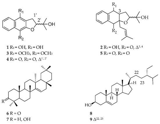 Further purification of fraction F6 using flash chromatography (Biotage Isolera, Upsalla, Sweden and Grace Reveleris, North Chicago, IL, USA) afforded a new derivative hydroxyavicenol C (1, 6.5 mg, 0.05%), and further fractionation of fraction F7 by preparative thin layer chromatography resulted in one new derivative, (+)-glycosemiquinone (2, 6.0 mg, 0.04%). Fraction F5 was purified using open column chromatography followed by flash chromatography (Biotage Isolera, Sweden), also yielding three pure compounds: avicenol C (3, 20.7 mg, 0.14%), avicequinone C (4, 5.7 mg, 0.04%) and glycoquinone (5, 25.7 mg, 0.18%). Further purification of fraction F3 gave four compounds, which were taraxerone (6, 148.8 mg, 1.03%), taraxerol (7, 124.0 mg, 0.84%), 0.76%), β-sitosterol (8, 32.0 mg, 0.22%) and stigmasterol (9, 108.9 mg).