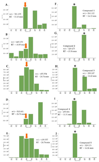 Relative abundance of target metabolites (A–E) and isolated naphthofuranquinone derivatives in the bioactive fractions (F–J). Arrows indicate the occurrence of the other target metabolites in the segregated bioactive fraction F5 as shown in Figure 2B. Asterisk specifies the fraction from where the respective compounds were isolated. (A) P_3575: m/z = 321.133, RT = 11.66 min; (B) P_39: m/z = 465.177, RT = 18.89 min; (C) N_243: m/z = 455.353; RT = 26.74 min; (D) m/z = 810.601 [M + H], RT = 29.12 min; (E) m/z = 439.357 [M + H], RT = 26.82 min; (F) P_3632: hydroxyavicenol (1), m/z = 261.112, RT = 14.12 min; (G) P_3702: semiglycoquinone (2), m/z = 329.175, RT = 13.36 min; (H) P_10291: avicenol C (3), m/z = 289.107, RT = 11.62 min; (I) P_3663: avicequinone C (4), m/z = 257.081, RT = 9.74 min and (J) P_3684: glycoquinone (5), m/z = 329.175, RT = 16.06 min.