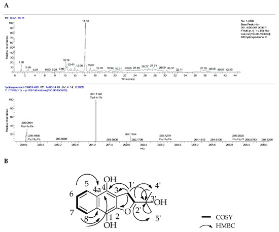 Compound 1 (6.5 mg) was isolated as a yellow oil and its molecular formula was determined by HRESI-MS (Figure 5A) as C15H16O4 with m/z 261.1120 [M + H]+ and calculated at −1.438 ppm error and optical rotation −8.4° (c 1.00, CHCl3). The 1H NMR results of 1 (Table 3) showed an AB system which had two different sets of proton signals. In the aromatic region, the spectrum indicated proton signals at δH 8.07 (dd, J = 7.4 Hz, 2H) and 7.68 (dt, J = 7.4 Hz, 2H) corresponding to two proton units for H-5 and H-8 as well as for H-6 and H-7, respectively. In the upfield region, an oxygenated methine proton was found at δH 4.83 as a triplet (J = 10.0 Hz, 1H, H-2′). In the COSY spectrum this proton correlated to a methylene proton at δH 3.15 (d, J = 10.0 Hz, 2H, H-1′). Meanwhile, two proton signals were observed at 1.24 and 1.39 ppm signifying the presence of methyl groups of 4′-CH3 and 5′-CH3, respectively. The 13C NMR (Table 4) showed 15 carbon signals with two carbonyl carbon signals at 159.3 and 153.7 ppm, corresponding to C-4 and C-1, respectively, that were shifted downfield because of the hydroxyl substituents on both positions, while δC 139.3 corresponded to C-2. Four quaternary carbon signals for rings A and B were found at δC 129.6 (C-4a), 126.4 (C-8a) and 125.1 (C-3) as well as one quaternary carbon signal on the side chain at δC 71.8 (C-3′). Four aromatic carbon signals were further observed at δC 134.2, 133.1, 126.4 and 126.1 for C-7, C-6, C-8 and C-5, respectively. The remaining carbon signals were found at δC 92.4 for a methine carbon attached to oxygen (C-2′) and a methylene carbon δC 29.2 (C-1′) and two methyl carbon signals at 24.1 and 25.8 ppm again indicating the presence of methyl groups of 4′-CH3 and 5′-CH3, respectively.