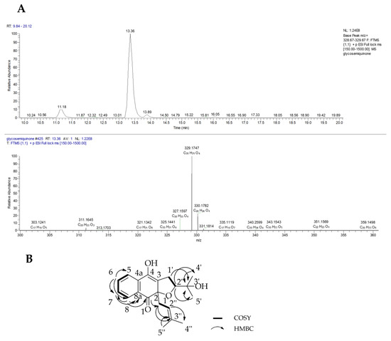 Compound 2 (6.0 mg) was isolated as a yellow oil and its molecular formula was determined by HRESI-MS (Figure 6A) as C20H24O4 with m/z 329.1747 [M + H]+, calculated at −0.504 ppm error and optical rotation +11° (c 1.00, CHCl3). The 1H NMR results of 2 (Table 3) showed an ABCD spin system with proton signals at δH 8.12 (d, J = 7.9 Hz, 1H), 7.72 (d, J = 7.8 Hz, 1H), 7.58 (t, J = 7.6 Hz, 1H) and 7.44 (t, J = 7.6 Hz, 1H) corresponding to protons H-8, H-5, H-6 and H-7, respectively. Two methyl signals located on aliphatic C-4′ and C-5′ remained the same to the known derivative glycoquinone (5). As in compound 5, the presence of a prenyl moiety was indicated by one methylene proton signal at δH 2.98 (m, 2H, H-1″) that correlated to a downfield proton at δH 4.77 (dd, J = 8.6, 6.3 Hz, H-2″) and two proton methyl singlets at δH 1.49 (s, 3H, H-4″) and 1.54 (s, 3H, H-5″). Compound 2 differed to that of 5 by the incidence of a downfield methylene proton at δH 3.00 (m, 2H, H-1′) positioned on the dihydrofuran ring. The methylene proton was split to give a multiplet due to the unsaturation at carbons Δ3,4 and the anisotropy effect between C-3 and C-4. A methine proton signal linked to oxygen was indicated by a doublet of a doublet signal (dd, J = 9.0, 4.3 Hz, H-2′) at δH 3.93.
