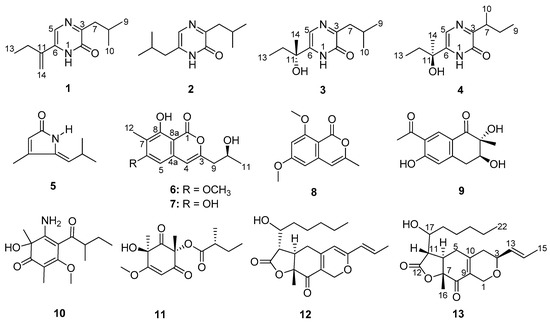 Compounds 2, 5 and 7–12 were elucidated as 3,6-diisobutyl-2(1H)-pyrazinone (2) [29], pulchellalactam (5) [30], lunatinin [also named 6, 8-dihydroxy-3-(2-hydroxypropyl)-7-methyl-1H-isochromen-1-one, 7] [31], 6,8-dimethoxy-3-methylisocoumarin (8) [32], monaspurpurone (9) [33], 5-amino-2,6-dimethyl-6-hydroxy-4-(2′-methyl-1-oxobutyl)-3-methoxy-2,4-cyclohexadien-1-one (10) [34], phomaligol A (11) [35] and monascuspiloin (12) [36], respectively, by comparing their spectroscopic data (Supplementary Figures S9, S10, S17, S18 and S27–S38) with the literature values. Some of the known compounds also showed various bioactivities. For example, pulchellalactam (5) exhibited potent CD45 protein tyrosine phosphatase inhibitor activity [30], lunatinin (7) was found to have a significant antibiofilm activity [37], monaspurpurone (9) showed strong DPPH radical scavenging activity [17], and monascuspiloin (12) showed effective inhibitory activity against both androgen-dependent LNCaP and androgen-independent PC-3 human prostate cancer cells [38,39].
