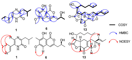 1H–1H COSY, key HMBC and key NOESY correlations of 1, 6 and 13.