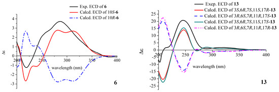 Comparison of the experimental and calculated ECD spectra of 6 and 13.