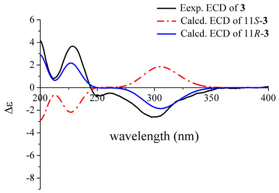 The relative stereochemistry of 13 was identified by the NOESY data. The large coupling constant (13.2 Hz) of the proton H-6 [δH 3.04 (ddd, 13.2, 9.6, 6.0 Hz)] with the proton H-11 [δH 2.75 (dd, 13.2, 3.0 Hz)] indicated that they were in opposite position on the ring. The NOESY cross peaks of H3-16 (δH 1.42) and H-11 (δH 2.75), H3-16 and H-1b (δH 4.44), H-1b and H-13 (δH 5.52) suggested that these protons were cofacial and assigned as β-orientation. The correlation between H-3 and H-1a (δH 4.37) suggested both of them having the α-orientation. The proton H-6 was determined as having an α-orientation because no NOESY correlation between H3-16 and H-6 was observed (Figure 2 and Supplementary Figure S46). Its absolute configuration was defined by calculated ECD. After calculation, it was found that the absolute configuration of C-17 was difficult to determine, 3S,6R,7R,11S,17R-13 and 3S,6R,7R,11S,17S-13 had almost the same result, which may be related to the fact that C-17 is too flexible in the branch, so only the absolute configuration of the remaining several chiral centers could be determined. By comparing the calculated curves with the experimental curve, the absolute configuration of compound 13 was defined as 3S,6R,7R,11S (Figure 3).