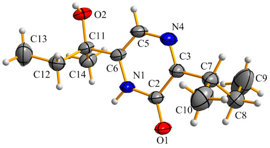2-Hydroxy-6-(1-hydroxy-1-methylpropyl)-3-sec-buthylpyrazine (4) was afforded as white needles. The molecular formula was determined as C12H20N2O2 by HR-(+) ESI-MS at m/z 225.15967 [M + H]+ (calcd. for C12H21N2O2, 225.15975) (Supplementary Figure S14), which has four degrees of unsaturation. Fortunately, we obtained a single crystal of 4 from a MeOH solution. The absolute configuration was unambiguously determined as 11S by single-crystal X-ray diffraction (Figure 5). Although its planar structure was reported by Sasaki et al. in 1968 [28], its NMR data (Table 1 and Supplementary Figures S15 and S16) and absolute configuration are reported for the first time.