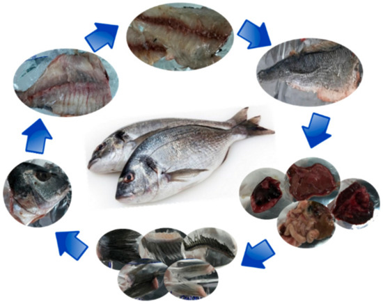 However, this large production volume also involves the generation of by-products that are not intended for human consumption. In 2016 approximately 37,900 tonnes of non-food products were obtained from fish processing industries [2]. These aquaculture by-products include backbones, belly flaps, fish fins, gills, heads, liver, roe, skin, viscera, and meat adhered to the bones [3]. The ratio between food fish and by-product varies by fishing fish size and species, season, and zone [4]. Thus, bones can account for percentages of 9%–15% of whole fish, while the head comprises 9%–12%, viscera 12%–18%, skin 1%–3%, and scales 5% [5].