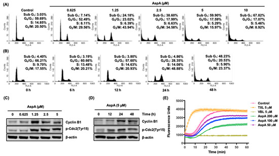 Effect of AspA on cell cycle progression and tubulin polymerization in RKO cells. (A,B) Cells were treated with the indicated concentrations of AspA for 48 h (A) or 5 μM of AspA for indicated times (B) and then analyzed by flow cytometry. (C,D) The levels of G2/M regulatory proteins in cells were determined after treatment with various concentrations of AspA for 48 h (C) or 5 μM of AspA over time (D) by western blot analysis. β-Actin was used as a loading control. (E) Inhibitory effect of AspA on tubulin polymerization. The tubulin assembly in the presence of vehicle or indicated compounds was analyzed by measuring the fluorescence emitted at 450 nm using 360 nm as an excitation wavelength for 60 min at 37 °C. Paclitaxel (TXL) and vinblastine (VBL) were used as reference compounds. The data are presented as means ± SD.