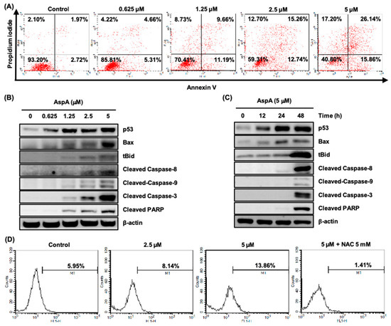 Cells arrested in mitosis eventually undergo apoptosis during mitotic arrest or exit mitosis, which is followed by cell death (via apoptosis or not), cell senescence and aneuploidy [19]. As shown in Figure 2A,B, AspA strongly induced the Sub-G1 cell population after the mitotic arrest. Therefore, we performed Annexin V-FITC and PI dual staining to confirm the induction of cell death. The compound treatment for 48 h led to an increase in early and late apoptosis, indicated by Annexin V-positive and Annexin V-PI dual positive, respectively (Figure 3A). Tumor suppressor p53 is critically involved in apoptotic cell death through modulation of Bcl-2 family members and activation of caspases and poly (ADP-ribose) polymerase (PARP) [20]. A concentration- and time-dependent activation of p53, pro-apoptotic Bcl-2 family member Bax and Bid, and cleavage of caspase-8, 9, 3 and PARP were detected in RKO cells treated with AspA, indicating the trigger of both intrinsic and extrinsic apoptotic pathways (Figure 3B,C). Moreover, AspA-mediated activation of caspases and PARP were prominent at 48 h (Figure 3C), which corresponds to Figure 2B. Some antimitotic agents, such as paclitaxel, vincristine, and taxotere, are also known to induce cell death by generating reactive oxygen species (ROS), which also leads to the cytotoxic bystander effect [21,22]. Thus, we assessed whether AspA promotes intracellular ROS with DCFH-DA staining using flow cytometry. As shown in Figure 3D, the intracellular ROS level in RKO cells increased in a concentration-dependent manner after 24 h treatment with AspA. In addition, the induction of ROS by AspA was reduced by co-treatment with a free radical scavenger, N-acetylcysteine (NAC). These results suggest that AspA-mediated cell death occurs through the sequential process of mitotic arrest and apoptosis, and the production of ROS further enhances the apoptotic cell death.