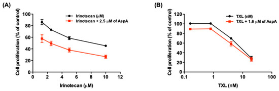 Effect of combined treatment with AspA and irinotecan or paclitaxel (TXL) on cell proliferation in RKO cells. (A,B) Cells were treated with the indicated concentrations of either irinotecan (A) or TXL (B) with or without AspA for 48 h. The cell proliferation was measured by SRB assay and the combination effect was determined by calculating combination index (CI) values. The data are presented as means ± SD.