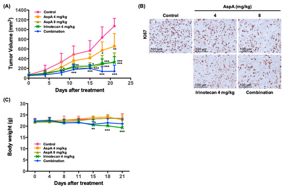 The in vitro antiproliferative effect of AspA was further evaluated in nude mouse tumor xenograft models implanted with RKO cells. Treatment with 4 or 8 mg/kg of AspA significantly inhibited the tumor growth by 38.9% and 68.7%, respectively, at the end of the study (Figure 5A, Table 4). Consistent with the in vitro findings, the combination of AspA with irinotecan demonstrated a moderate synergistic effect on suppressing the tumor growth (Figure 5A, Table 5). Antitumor activity of the compound was further supported by the decreased staining of Ki-67, a cellular proliferation marker, in tumor sections from groups treated with AspA alone and a combination of AspA and irinotecan (Figure 5B). A group treated with irinotecan alone was assessed in parallel. As expected, irinotecan showed strong inhibition of tumor growth and Ki-67 expression (Figure 5A,B). No overt toxicity or body weight change was observed in AspA-treated groups, whereas reduced body weight was detected in irinotecan-treated groups (Figure 5C). Taken together, AspA alone and co-treatment with irinotecan effectively suppressed the growth of RKO xenograft tumors. Although further experiments are needed, AspA may help reduce the toxicity of irinotecan by lowering its dose but maintaining the equivalent antitumor activity.