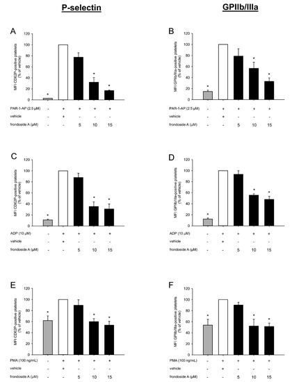 Platelet aggregation is mediated by specific surface adhesion molecules. To analyze the effect of frondoside A on this process, the expression and activation of the two adhesion proteins P-selectin (CD62P) and GPIIb/IIIa were analyzed by flow cytometry. For this purpose, PRP was incubated with different concentrations of frondoside A for 30 min, followed by agonist stimulation with protease-activated receptor-1-activating peptide (PAR-1-AP), ADP, and phorbol-12-myristate-13-acetate (PMA). As expected, the three agonists markedly increased the surface expression of P-selectin (Figure 2A,C,E) and the activity of GPIIb/IIIa (Figure 2B,D,F). It was of note that frondoside A concentration-dependently decreased the expression of P-selectin and suppressed the conformal switch of inactive GPIIb/IIIa into its active form (Figure 2A–F).