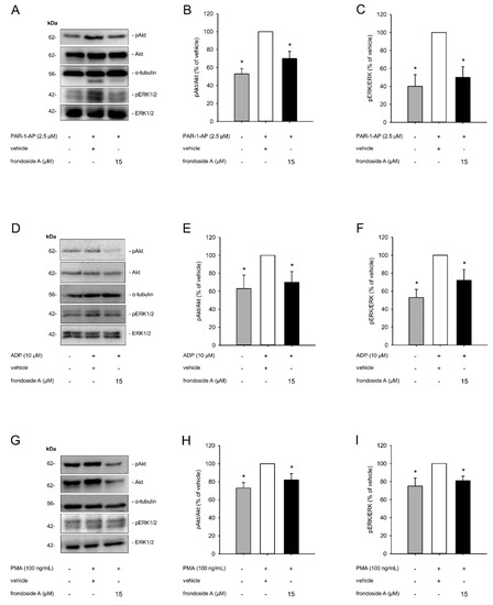 Previous studies have demonstrated that frondoside A is capable of inhibiting the PI3K pathway, which is known to be crucial for platelet activation. Therefore, we further investigated the influence of this compound on the activity of the PI3K downstream effectors Akt and ERK1/2. Western blot analyses revealed that agonist-induced platelet activation increased the phosphorylation of Akt and ERK1/2, which, in turn, was suppressed by frondoside A (Figure 3A–I). These findings clearly indicated that frondoside A inhibits platelet activation by interfering with the PI3K pathway.