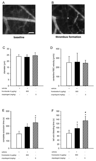 Finally, we tested the antithrombotic activity of frondoside A on photochemically induced thrombus formation in the dorsal skinfold chamber model (Figure 4A,B). For this purpose, BALB/c mice were treated with frondoside A and vehicle as well as clopidogrel, which was chosen as a positive control due to its well-known antithrombotic activity [20]. Subsequently, the complete vessel occlusion time of postcapillary and collecting venules was measured. To exclude the possibility that this measurement was affected by altered microcirculatory conditions, we first analyzed the diameters and centerline red blood cell (RBC) velocities of these vessels. This analysis did not show any differences between the three groups (Figure 4C,D). In line with our in vitro results, we further found that frondoside A significantly prolonged the vessel occlusion time (Figure 4E). Moreover, frondoside A also significantly prolonged the tail vein bleeding time when compared to vehicle-treated controls (Figure 4F).
