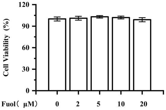 To evaluate the effects of Fuol on BV-2 cell viability, a cell counting kit-8 (CCK-8) assay was carried out with BV-2 cells. As shown in Figure 2, after 24 h of incubation with different concentrations of Fuol (from 2 μM up to 20 μM), the cell viability of BV-2 cells was not appreciably altered by any doses of Foul treatment. LPS (1 μg/mL) decreased the cell viability to 82.61%, while pretreatment with Fuol (20 μM) increased the cell viability to 88.19% (Figure S1). Thus, concentrations of Fuol from 5 to 20 μM were used in the subsequent experiments.