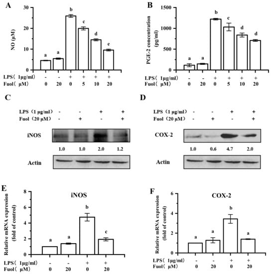 NO, an important mediator in the inflammatory response, was determined by Griess reagent. As shown in Figure 3A, stimulation with LPS led to a marked increase in NO production. In contrast, Fuol significantly suppressed the production of NO in a dose-dependent manner. It is generally known that NO production is mainly dependent on the iNOS expression. Accordingly, we explored the effects of iNOS expression. As shown in Figure 3C,E, the expression of iNOS was notably inhibited by Fuol at both protein level and mRNA level. PGE2, a mediator of inflammation as well, is produced from LPS-induced endogenous arachidonic acid by COX-2 in stimulated microglial cells. As illustrated in Figure 3B, Fuol treatment resulted in evident attenuation of the secretory levels of PGE-2 in a dose-dependent manner. Meanwhile, Fuol markedly hampered COX-2 protein expression (Figure 3D) and mRNA transcription (Figure 3F).