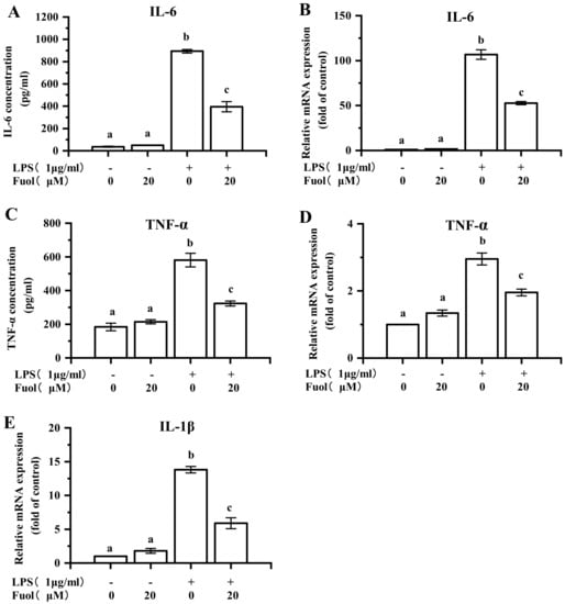 It has been recognized that LPS stimulation in BV-2 cells evokes various pro-inflammatory cytokines secretion, including IL-1β, IL-6, TNF-α, and etc. Herein, we assessed the effects of Fuol on the LPS induced pro-inflammatory cytokines production. As exhibited in Figure 4A,C, compared with control, LPS stimulation induced an evident increase of IL-6, TNF-α in the cell culture supernatant via ELISA method determination. However, the pretreatment with Fuol impaired the production of pro-inflammatory cytokines when compared to the LPS challenge. Ulteriorly, we determined whether Fuol could hinder the mRNA expression of IL-6 and TNF-α. Consistently, the pretreatment of Fuol effectively impeded the mRNA expression of IL-6 and TNF-α induced by LPS in BV-2 cells (Figure 4B,D). In addition, we examined the mRNA expression of IL-1β, Fuol significantly impaired the up-regulation of IL-1β by LPS treatment accordingly (Figure 4E). These data showed that Fuol suppressed the LPS-induced production of inflammatory cytokines in BV-2 cells.