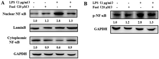 To further investigate the mechanism underlying the anti-inflammatory effects of Fuol, we concentrated on the NF-κB signaling pathway. NF-κB, a primary regulator of genes, plays an important role in the induction of pro-inflammatory cytokines. Thus, we investigated whether Fuol hindered the NF-κB signaling pathway. For this purpose, we first analyzed the effect of Fuol on NF-κB p65 phosphorylation level in whole-cell extracts. As shown in Figure 5B, the stimulation of BV-2 cells with LPS led to the marked increase of NF-κB p65 level phosphorylation, which could be notably reduced by Fuol pretreatment. Then, we examined the expression of NF-κB p65 in the nucleus and cytoplasm. As shown in Figure 5A, LPS stimulation resulted in decreased NF-κB p65 level in the cytoplasm and increased NF-κB p65 level in nucleus compared with unstimulated cells. In contrast, pretreatment with Fuol attenuated the NF-κB p65 level in the nucleus, which indicated that Fuol treatment inhibited NF-κB p65 translocation from the cytoplasm into the nucleus. Collectively, our results demonstrate that Fuol inhibited LPS stimulated inflammation response via the NF-κB pathway.
