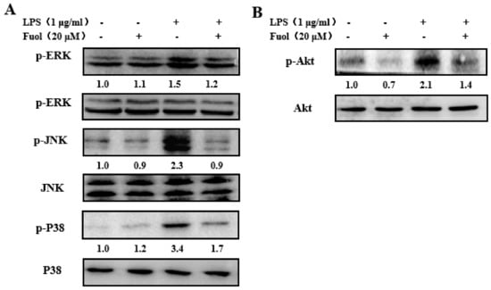 Previous studies have demonstrated MAPKs involved in the regulation of the NF-κB pathway in microglia []. Therefore, we examined the effect of Fuol on MAPKs activation. As exhibited in Figure 6A, LPS treatment markedly promoted the phosphorylation of MAPKs, including ERK, JNK, and P38 compared to the control, along with the unaltered basal expression level of corresponding MAPKs. Whereas Fuol effectively ameliorated phosphorylation of MAPKs, which indicated Fuol blocked the MAPKs pathway and then inhibited the LPS-induced inflammatory responses in BV-2 cells. Furthermore, the PI3K/Akt signal pathway plays a necessary role in the NF-κB-mediated inflammatory response as well, thus, we investigated the influence of Fuol on Akt phosphorylation. As shown in Figure 6B, LPS stimulation increased Akt phosphorylation in comparison with the untreated group, without changing the basal level of Akt. Inversely, Fuol significantly reversed the Akt phosphorylation level. Our results suggested that Fuol impeded the LPS-stimulated inflammatory response via the Akt signaling pathway.