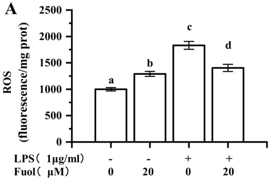 BV-2 cells were cultured in 6-well plates and treated with LPS (1 μg/mL) in the presence or absence of indicated dose of Fuol at 37 °C for 6 h. After incubation, 10 μM 2′, 7′-dichlorofluorescein diacetate (DCFH-DA) was added and incubated for 30 min at 37 °C. Then, cells were washed twice with PBS (0.01 M, pH 7.4) and immediately harvested and lysed with cell lysis buffer (Beyotime Institute of Biotechnology, Jiangsu, China). The fluorescence of the supernatant of the cell extract was read at excitation/emission wavelengths of 485/525 nm by using a fluorescence microplate reader.
