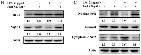 ROS, are involved in microglia activation. This finding demonstrated that Fuol could attenuate the LPS-induced increase of the intracellular ROS in BV-2 cells (Figure 7A). Nrf2 has been recognized as the prominent signaling mediator modulating redox homeostasis and executing anti-inflammatory effects through regulating cytoprotective enzymes and the related proteins, including HO-1 and NQO-1. As shown in Figure 7B, Fuol alone pretreatment group markedly up-regulated the protein expression of HO-1 and NQO-1 in comparison with the control group. Besides, the LPS-stimulated group resulted in a decrease in HO-1 and NQO-1 expression, which remarkably increased after Fuol pretreatment. We further examined the effect of Fuol on Nrf2 translocation in BV-2 cells. Fuol promoted the translocation of Nrf2 into the nucleus and a decrease in the cytoplasm compared to untreated cells. In addition, Fuol pretreatment ameliorated the decline in LPS induced nuclear accumulation of Nrf2 and reduced the Nrf2 expression in the cytoplasm compared with LPS treatment (Figure 7C). In general, our results suggest that Fuol attenuates neuro-inflammation partly via promoting the Nrf2 antioxidant protective mechanism in BV-2 microglia.