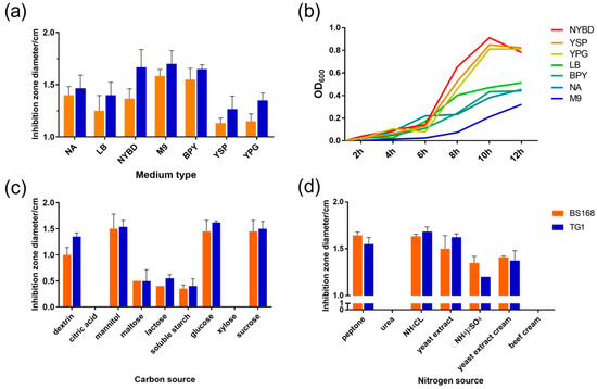 Effects of various media and main ingredient sources on antibacterial activity. (a) Effect of different media (nutrient agar (NA), Luria-Bertani (LB), nutrient yeast beef glucose (NYBD), M9, beef peptone yeast (BPY), yeast sucrose peptone (YSP), and yeast peptone glucose (YPG)) on the antibacterial activity of metabolites. TG1 and BS168 (representing the Gram-negative and Gram-positive bacteria, respectively) were used to detect antibacterial activity. The Y axis represents the diameter of the inhibition zone, indicating the antibacterial activity of metabolites. (b) Growth curves of GBacillus-9 in different media. Effects of (c) carbon and (d) nitrogen sources on the antibacterial activity of metabolites in M9 medium. The sources of carbon included dextrin, citric acid, mannitol, maltose, lactose, soluble starch, glucose, xylose, and sucrose. The sources of nitrogen included peptone, urea, NH4Cl, yeast extract, (NH4)2SO4, yeast extract cream, and beef cream.
