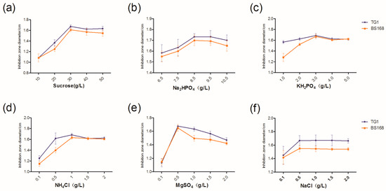 Seven nitrogen sources were assessed based on the antibacterial activity. As shown in Figure 1c, NH4Cl, yeast extract, and peptone had similar antibacterial effects against TG1 and BS168. The addition of urea and beef cream led to the loss of antibacterial activity. NH4Cl was selected as the nitrogen source because of its advantages, such as low cost and source availability.