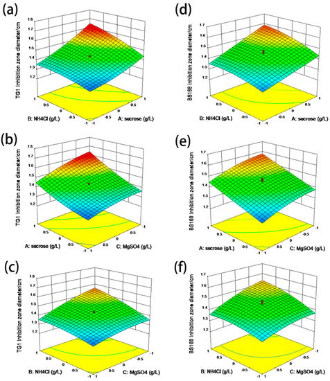 The three-dimensional response surfaces and contour plots illustrated in Figure 4 depict the interactions of sucrose, NH4Cl, and MgSO4 on antibacterial material yield by using TG1 and BS168 as substrates [23,24]. These results also directly show the response over a region of independent variables and the relationship between the experimental levels of each factor. Figure 4a reveals the effects of sucrose and NH4Cl on the antibacterial material yield of GBacillus-9, indicating that the inhibition zone increased upon increasing sucrose and NH4Cl. The maximum inhibition zone diameter was observed when the concentrations of sucrose and NH4Cl were at 64.8 and 1.84 g L−1, respectively. Subsequently, the inhibition zone diameter of TG1 declined with the increase in sucrose and NH4Cl concentrations. Increasing the concentration of MgSO4 to more than 0.08 g L−1 resulted in a decreased inhibition zone diameter. The effect of MgSO4 on inhibition zone diameter is displayed in Figure 4c, which had a trend similar to those in Figure 4a,b. The inhibition zone diameter of BS168 was smaller than that of TG1 under the same culture medium, as shown in Figure 4d–f, but a similar antibacterial effect trend was observed in Figure 4a–c. Finally, the optimal concentrations of sucrose, NH4Cl, and MgSO4 in the culture medium for GBacillus-9 were 64.8, 1.84, and 0.08 g L−1, respectively. Under the optimum conditions, the predicted maximum diameters of TG1 and BS168 inhibition zones were 1.93 and 1.82 cm, respectively.