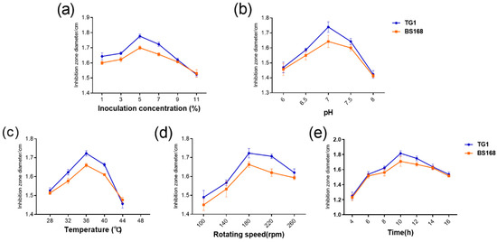The fermentation time, temperature, inoculum volume, initial pH, and rotation speed were also assessed to further explore the optimal fermentation conditions of GBacillus-9. As shown in Figure 5, the inhibition zone diameter of anti-TG1 and anti-BS168 showed a similar pattern, that is, the inhibition zone diameter increased with fermentation time, temperature, inoculum volume, initial pH, and rotation speed. The maximum inhibition zone diameters of anti-TG1 and anti-BS168 were achieved when the fermentation time, temperature, inoculum volume, initial pH, and rotation speed were 10 h, 36 °C, 5%, 7.0, and 180 rpm, respectively. Subsequently, the inhibition zone diameter of TG1 declined with fermentation time, temperature, inoculum volume, initial pH, and rotation speed.