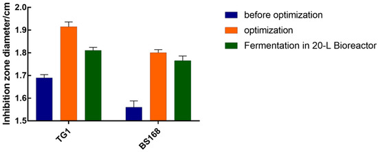The optimized fermentation conditions (inoculum volume of 5%, initial pH of 7.0, rotating speed of 180 rpm, and temperature of 36 °C) was verified using a 20 L bioreactor to determine whether the results predicted by the model were consistent with the actual results. The fermentation product was subjected to an antibacterial activity test. Figure 6 showed that the culture supernatant of GBacillus-9 had inhibition zone diameters of 1.82 and 1.78 cm for TG1 and BS168, respectively. These results were in agreement with the predicted values.