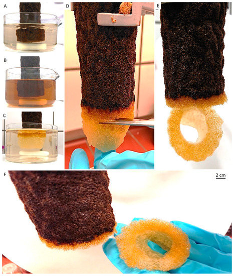 The procedure for the isolation of chitin-based scaffolds from verongiid sponges, as reported by us [24], was followed here. In brief, it was performed accordingly to the following steps: (I) sponge skeleton was washed three times with distilled water in the vessel on a magnetic stirrer, to remove water-soluble compounds, for 6 h (Figure 3A). Afterward, the water was changed (step II) with 2.5 M of NaOH, at 37 °C, for 24 h, for deproteinization and depigmentation (Figure 3B). This step was then followed by (step III) treatment with 20% CH3COOH at 37 °C, for a period of 24 h, to remove residual calcium and magnesium carbonates and then washing in distilled water up to pH 6.8. Steps II and III were repeated two times, to obtain colorless tubular scaffolds (Figure 3D–F). The purity of isolated chitin scaffolds has been proved according to standard analytical procedures as described previously [4].
