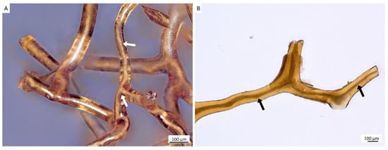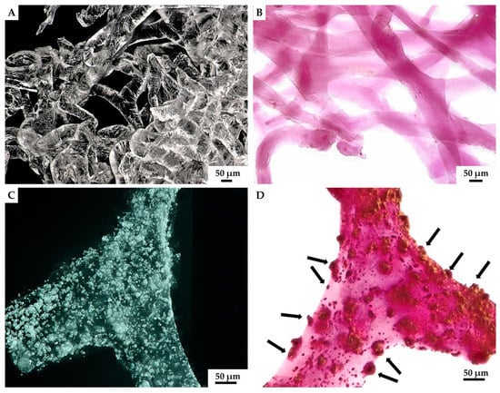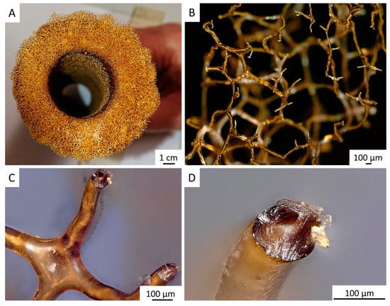For the isolation of ready-to-use chitinous scaffold (Figure 6), we used the standard alternating alkaline-acid-based treatment [24], which took in this case up to four days at room temperature. During this procedure, the presence of interconnected inner channels located within skeletal microtubes could be well-visualized (Figure 5). Following this simple treatment, the tube-like skeleton of A. archeri was completely demineralized, cell- and pigment-free, mechanically flexible (Figure 6A) and transparent.