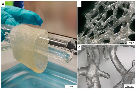 After purification, a translucent tube-like chitinous scaffold derived from A. archeri (see Figure 3) remains stable enough, but flexible after being saturated with water (A). It takes over the shape of respective hard surface, for example, this glass tube. The 3D architecture of the scaffold made of interconnected microtubes is very visible, using digital stereo microscopy (B,C). The porosity of such scaffold ranges between 300 and 800 µm.