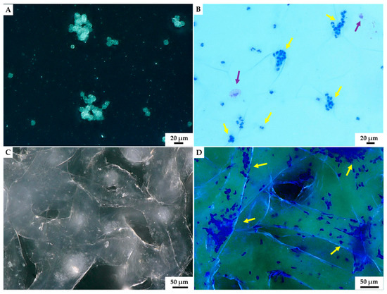 Light microscopy imagery. Characteristic aggregates of hemocytes present in isolated hemolymph of C. aspersum snail was observed both without (A) and using eosin and methylene blue staining (B) on the glass slide. The formation of hemocytes-based clumps before (C) and after staining by eosin and methylene blue (D) became visible on the surface of A. archeri chitinous scaffold 24 h after the immersion in hemolymph. Two hemocytes types could be distinguished after staining: most dominant granulocytes (yellow arrow) and single hyalinocytes (violet arrow).