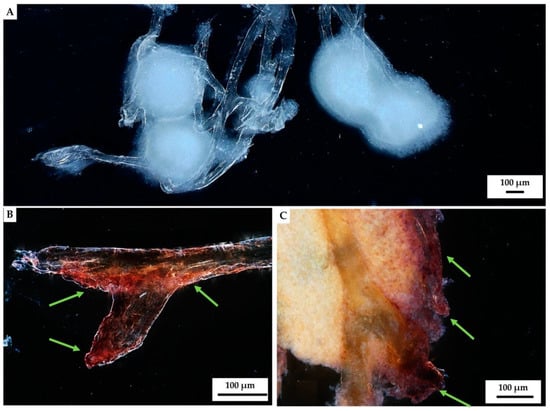 Stereo microscopy imagery of hemocyte clusters formed on the fibers of A. archeri chitinous scaffolds. Round white-colored clusters (A) of disintegrating hemocytes appeared 48 h after chitin immersion into the hemolymph isolated from C. aspersum snail (Figure 2 and Figure 14). Calcium-rich cytoplasmic dense microparticles (arrows) within the disintegrating granulocytes became visible after staining with Alizarin Red S on the chitinous fiber (B), as well as on the surface of the hemocytes cluster (C).