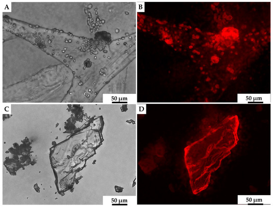 Both calcite mineral standard (A) and the mineral phase observed after ex vivo biomineralization of 3D chitin scaffold, using hemolymph of C. aspersum snail (C), possess very similar features with respect to their auto-fluorescence [116] (B,D, respectively).