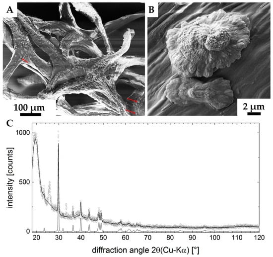 SEM images (A,B) of the ex vivo mineralized surface of 3D chitinous scaffold confirm the presence of microcrystallites (arrows). X-ray diffraction pattern of the sample is represented in the image C. Measured data are open dots; the refinement is highlighted by the solid line. The diffractogram of calcite-CaCO3 is shown at the bottom, clearly verifying the presence of this phase in the sample. Two unassigned peaks remain in the data (2θ ≈ 27°, 2θ≈ 33°). The large feature at 2θ ≈ 20° indicates a high content of amorphous material in the sample (C).