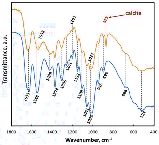 ATR-FTIR spectra of A. archeri chitin scaffold before (blue line) and after ex vivo biomineralization (orange line) within the region of 1800–400 cm−1.