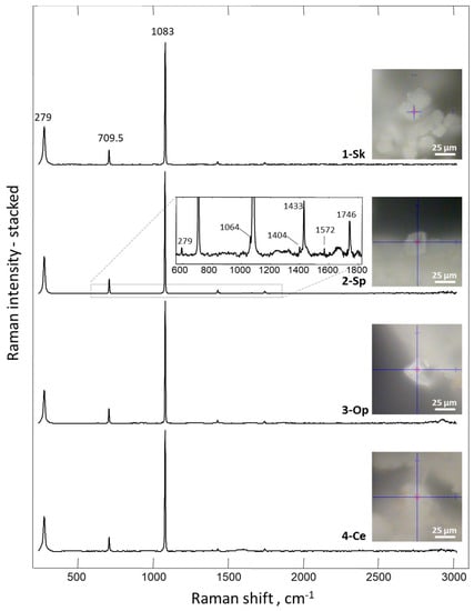 The results obtained by employing Raman spectroscopy clearly showed (Figure 13) that the spectrum recorded for crystals obtained after ex vivo biomineralization corresponds to the spectra acquired for the biogenic calcite [121,122]. The most intensive band, with the maximum near 1083 cm−1, corresponds to ν1 symmetric stretching vibrations CO32− of calcite [121,123], where the peak detected at 1433 cm−1 is related to CO32− ν2 asymmetric stretching vibrations [124]. Additional evidence of calcite polymorph presence is provided by the bands at 711 and 279 cm−1. These two peaks are related to ν4 in-plane bending vibrations of CO32− and vibrational modes of calcite, respectively [124]. Moreover, all present bands are consistent with calcite, as reported for the natural mineral in the RRUFF database (http://www.rruff.info/ (03.12.2019))