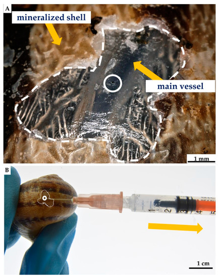 For hemolymph collection, the modified nonlethal intravital method described in Polish patent P.410296 and article [159] was used. The shell surface of the selected C. aspersum snail was cleaned with 70% ethanol. After that, a piece of shell was removed, and 3 h later, about 1000 μL of hemolymph was isolated from an individual of C. aspersum by main-vessel puncture, using a sterile syringe and needle [159] (see Figure 14). Twelve hours post-isolation, an organic film was observed in the site of removed shell fragment, which was fully mineralized within the next few days [160]. During the next three months after the procedure, the snails used in this study did not show any visible changes in their physiology or in behavior.