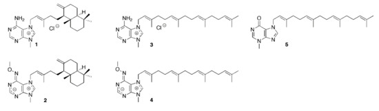 Marine bioprospecting has provided many compounds of interest, particularly from demosponges [6,7,8,9,10]. Certain marine sponges and gorgonians (sea fans; soft corals) produce bioactive metabolites that can be regarded as hybrids between a diterpenoid and a purine derivative. These compounds are adenine or (hypo) xanthine derivatives, often carrying the terpenoid substituent at the N-7 position of the purine ring. Representative examples are the agelasines [11] and malonganenones [12], such as agelasine D (1) and malonganenone J (5) (Figure 1).