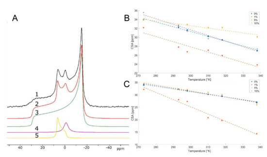 Deconvolution and chemical shift anisotropy (CSA) parameter extraction of selected hydrated lipid samples. (A) Representative deconvolution of 31P wide line NMR data of hydrated dioleoylphosphatidylethanolamine (DOPE) at 273 K, with a 10% addition of compound 1. Individual traces represent 1—Acquired wide line spectra, 2—Sum of fitted shapes, 3—Fit of lamellar phase, 4—Fit of isotropic phase, 5—Fit of inverse hexagonal phase. (B) CSA of dioleoylphosphatidylcholine (DOPC) lamellar phase after addition of 0%, 1%, 5%, or 10% of compound 4. Dashed lines show linear fits of CSA changes with increasing temperature. (C) CSA of DOPC lamellar phase after addition of 0%, 1%, 5%, or 10% of compound 5. Dashed lines show linear fits of CSA changes with increasing temperature. Upon extracting the CSA parameters associated with the lamellar phases, it is possible to plot them as a function of temperature and additive percentage [53]. Generally, and as expected, the CSA parameters fall as temperatures increase (Figure 2B,C). For pure DOPC at 273 K, the CSA of the 31P nuclei in their headgroups are 34 for DOPC (Figure 2). This value suggests a significant orientation and restriction. Only for compound 4 and 5 in DOPC, we see a significant perturbation of the CSA values. Intriguingly, the 1% addition has the strongest effect (Figure 2B,C).
