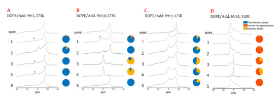 The low-concentration effects, including the appearance of non-lamellar phases and lowered CSA values, suggest that the compounds elicit complex changes in the lipid environment. It seems that when their concentrations increase, the interactions between the additives themselves help to stabilize the lamellar phase. As the concentration of compounds decreases, so do available partners for drug-to-drug interaction, and the compound starts to have an inverse effect: by disturbing the lipid bilayer and reassembling it into an isotropic phase. The possibility of self-inhibitory effects is important in the investigation of drug dosing [57]. The exact nature of the lipid organization giving rise to the isotropic 31P NMR resonance, including whether the compounds partition preferentially into them or not, was not determined in this study. In principle, micelles, small vesicles, and bicubic phases may all give rise to isotropic 31P NMR resonances. It may be possible to differentiate between these situations using 31P relaxation measurements on model systems prepared explicitly for this purpose [58].