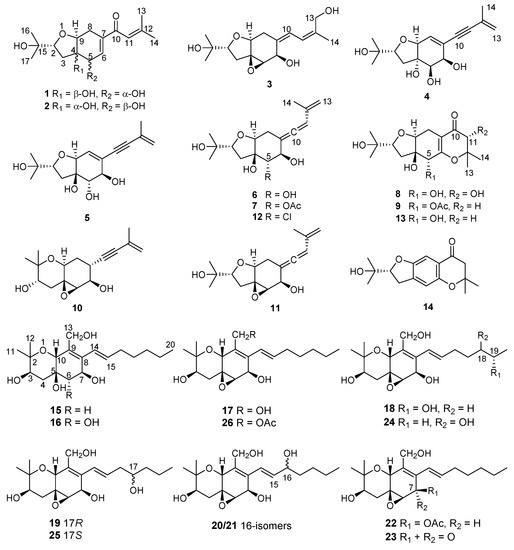 The following are available online at https://www.mdpi.com/1660-3397/18/2/129/s1, UV, HRMS, 1D and 2D NMR spectra of all the new compounds 1–9 and 15–23 as well as spectra for Mosher’s esters of 1, 7, 8, 17, 18, 25 and 26.