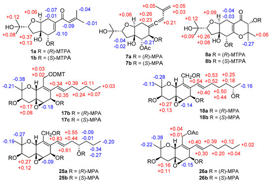 ∆δ = (δS − δR) values (in ppm) for the methoxytrifluoromethylphenylacetic acid (MTPA) esters of 1 and 8, ∆δ = (δR − δS) values (in ppm) for the MPA esters of 7, 17, 18, 25, and 26.