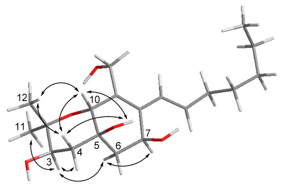 Pestalotheol K (3) has the molecular formula C16H24O5, containing one additional oxygen atom compared to truncateol Q, a polyketide analog isolated from Truncatella angustata [15]. The NMR data of 3 (Table 1) were similar to those of truncateol Q, except for the replacement of an olefinic methyl by an oxygenated methylene moiety at δC 60.9 and δH 4.21 and 4.16 (CH-13) and a hydroxy group at δH 3.70 (t, OH-13). The COSY correlation between OH-13/H-13ab and the HMBC correlations from H-13ab to C-11 (δC 122.8), C-12 (δC 139.9), and C-14 (δC 22.0) confirmed the location of this additional oxygenated methylene moiety at C-13. The remaining substructure and relative configuration of 3 were elucidated to be identical to truncateol Q after detailed analysis of the 2D NMR spectroscopic data of 3.