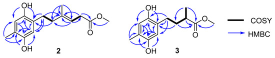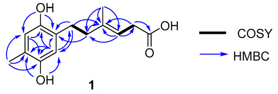 Compound 1 was isolated as a deep yellowish powder, and the HRESIMS ion detected at m/z 249.1134 [M − H]− indicated a molecular formula of C14H18O4, accounting for six degrees of unsaturation. 1H NMR data (Table 1) displayed resonances for two methyls (δH 1.60, s, H3-14; 1.97, s, H3-15), three methylenes (δH 2.48, m, H2-7; 2.12, m, H2-8; 2.93, d, H2-11), three olefinic protons (δH 6.44, s, H-3; 6.44, H-6; 5.26, t, H-10), and two phenolic hydroxyls (δH 8.34, s, 1-OH; 8.30, s, 4-OH). The 13C NMR as well as DEPT and HSQC spectrum data in dicated 14 carbon resonances assignable to two sp3 methyls (δC 16.7, C-14; 16.2, C-15), three sp3 methylenes (δC 28.7, C-7; 39.9, C-8; 33.7, C-11), three sp2 methines (δC 116.2, C-3; 117.5, C-6; 116.8, C-10), and six quaternary carbons (δC 147.5, C-1; 126.0, C-2; 147.9, C-4; 121.7, C-5; 138.2, C-9; 173.5, C-12). Careful analysis of the 13C NMR data of 1 revealed a hydroquinone-type skeleton, which was further verified by the HMBC correlations (Figure 2). Detailed analysis of the COSY spectrum revealed spin systems, including H-7/H-8 and H-10/H-11 (Figure 2). The presence of side chain C-7/C-8/C-9(C-15)/C-10/C-11/C-12 was supported by the HMBC correlations from H-15 to C-8, C-9, and C-10, and from H-11 to C-9, C-10 and C-12. Further HMBC cross peaks from H-7 to C-2 and C-3 and from H-8 to C-2 attached the side chain to C-2. The E geometry of the double bond between C-9 and C-10 was inferred based on the NOESY correlations from H-15 to H-11 and from H-10 to H-8. Accordingly, the structure of 1 was established as shown and named as ketidocillinone A.